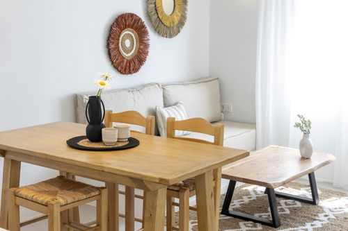 The Rodia Apartment, covering 60 m², is designed to comfortably accommodate up to five guests. Bathed in warm, earthy tones, this inviting space beautifully combines simplicity and elegance. The symbolism of the pomegranate, representing abundance, subtly influences the thoughtful design throughout the apartment. It features two bedrooms, including one with a double bed and another with two single beds, as well as a single sofa bed in the living room, ensuring a cozy stay for all.